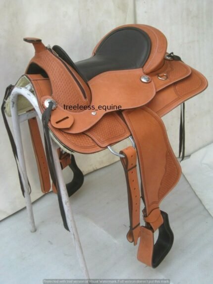 Western show saddle 16″ on eco leather with color natural with black leather combination on drum dye finished.